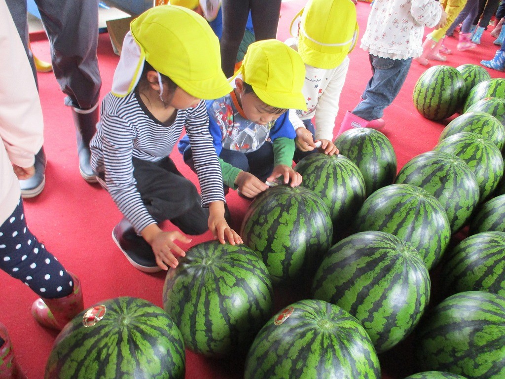 お手伝いが終わると、大きなすいかのご褒美をいただきました☆子どもたちは大喜び(*^_^*)
