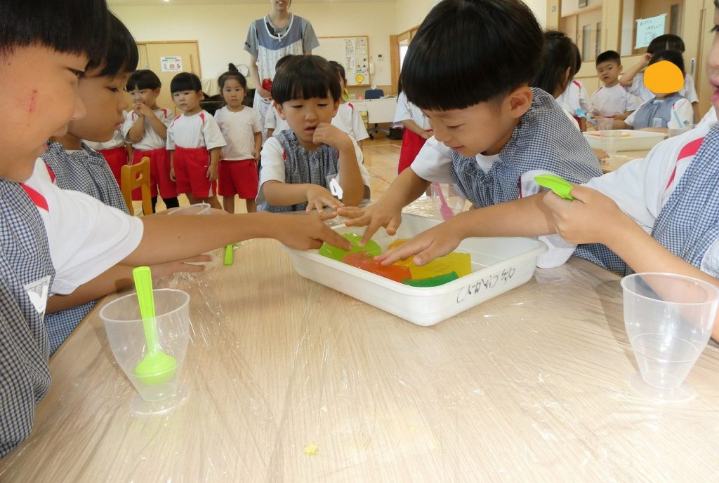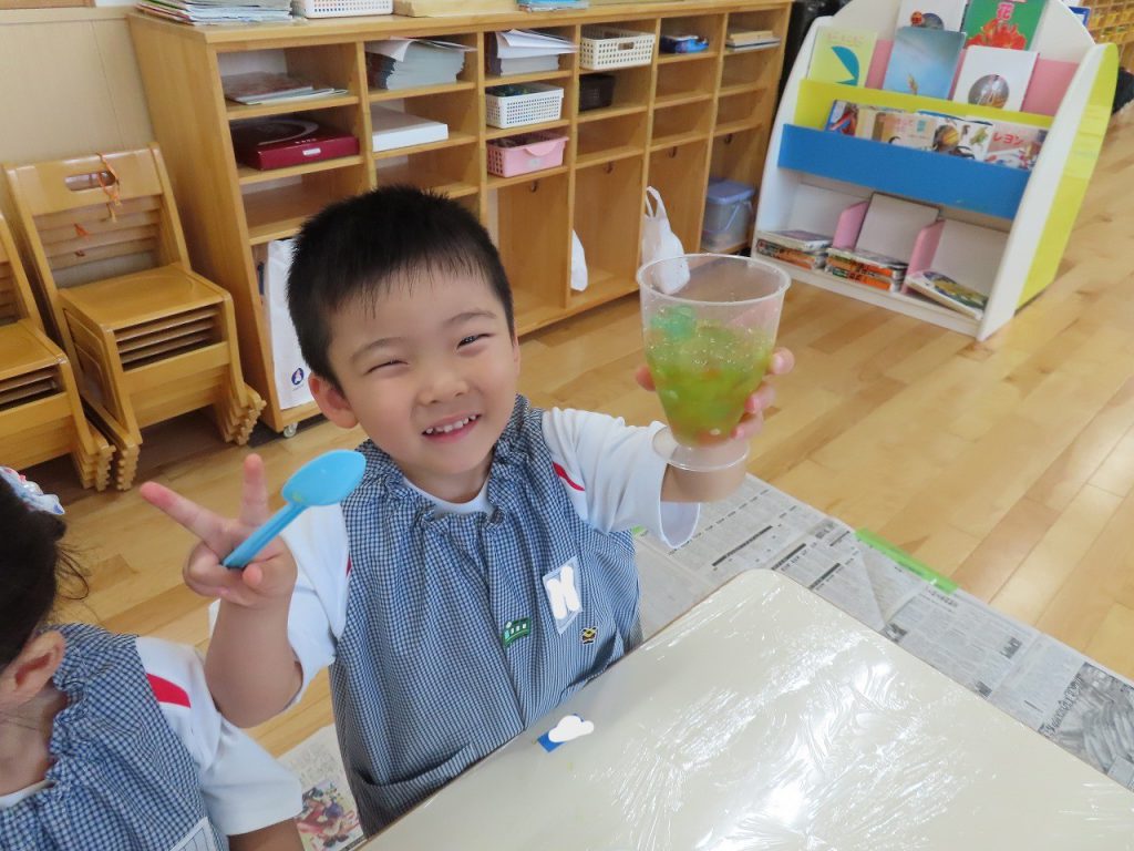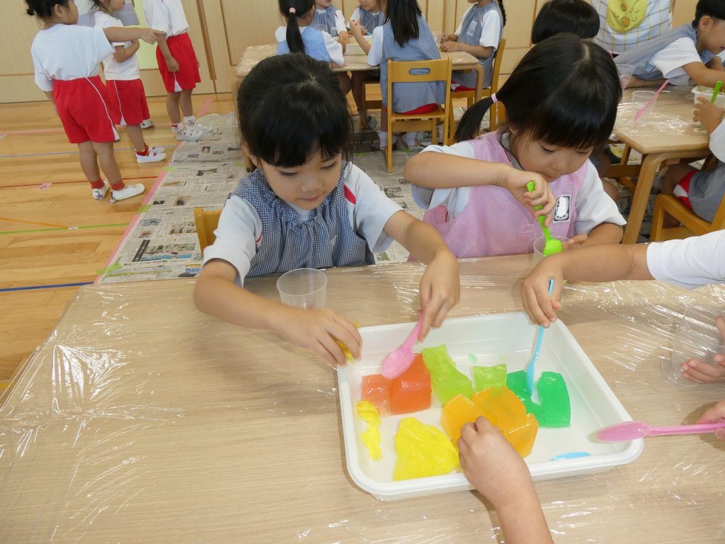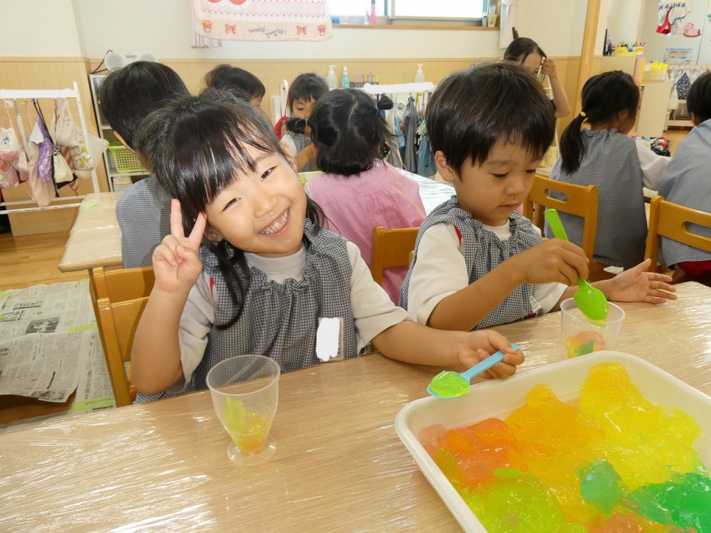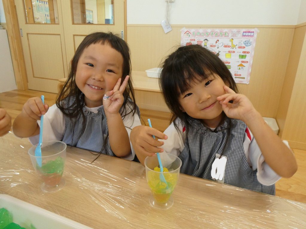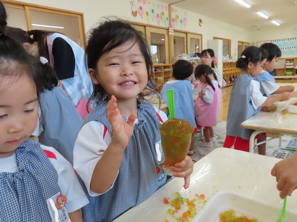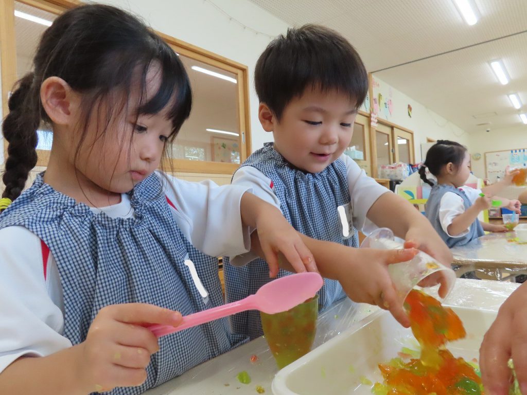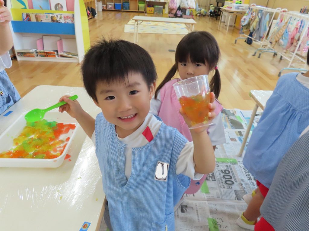 コップにカラフルな寒天を入れ、「はいどうぞ」とやり取りを楽しんでいる姿も見られました♪