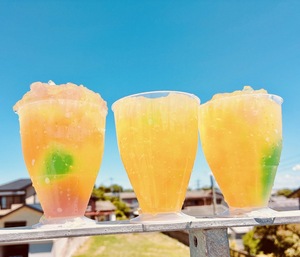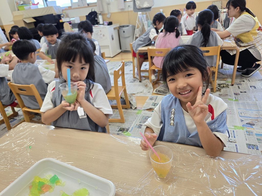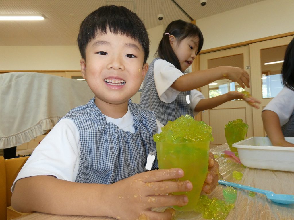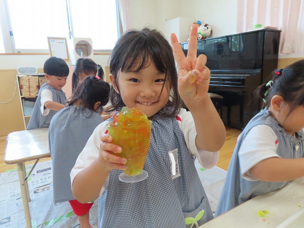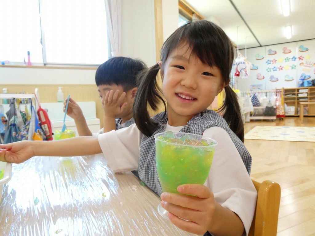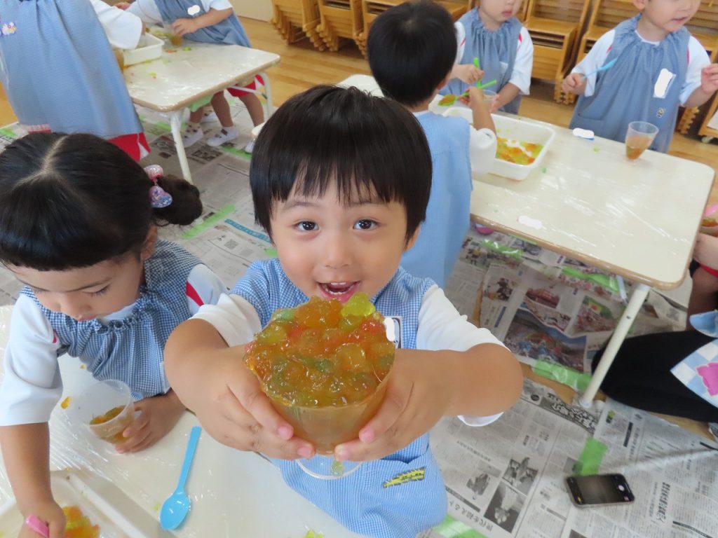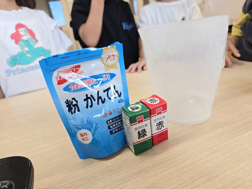 コップにカラフルな寒天を入れ、「はいどうぞ」とやり取りを楽しんでいる姿も見られました♪