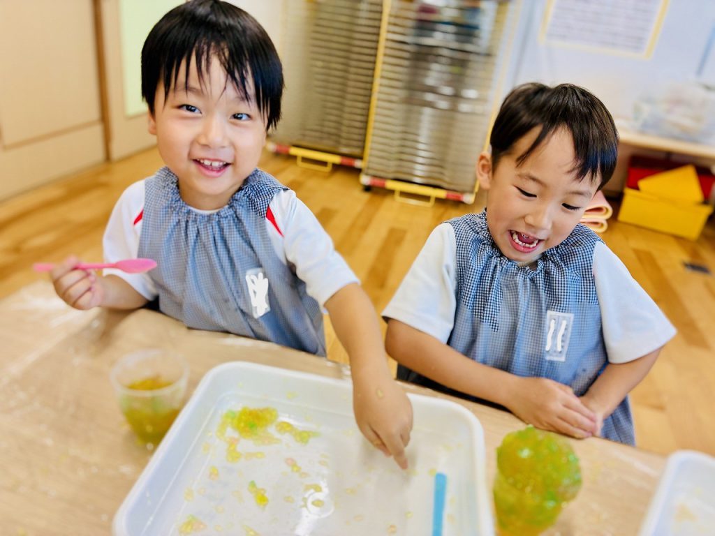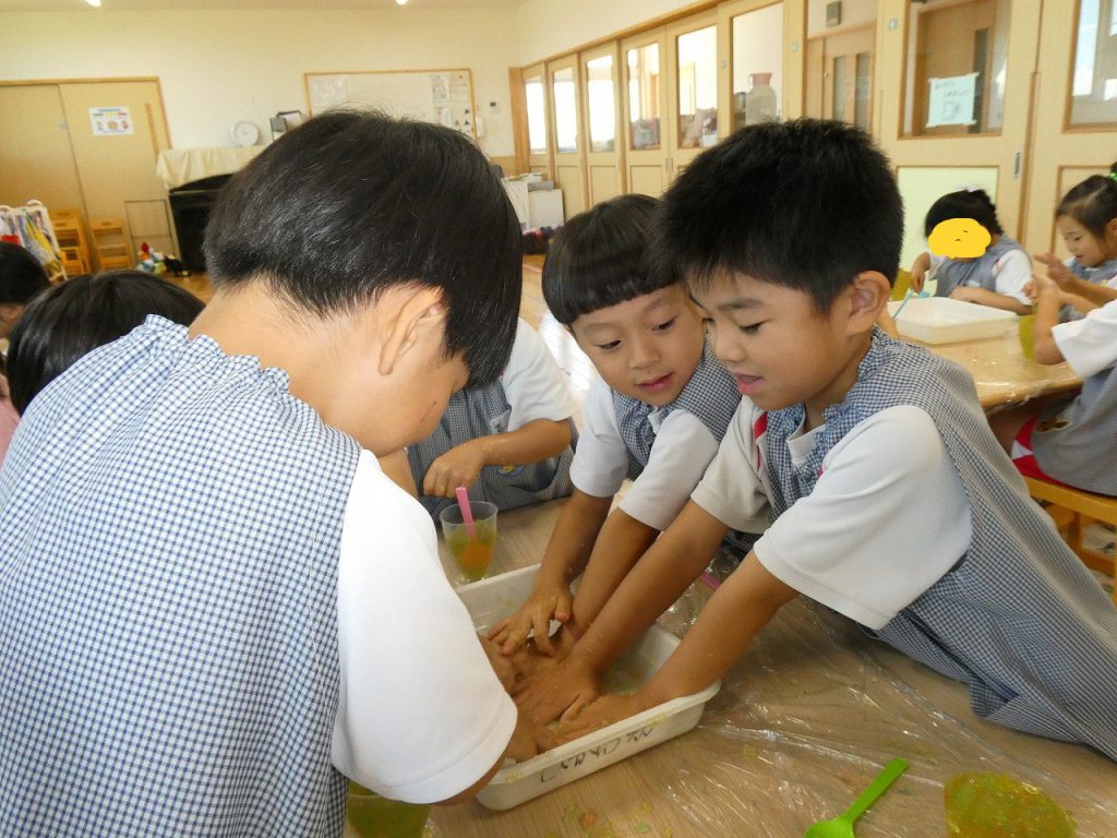 初めは抵抗があった子もいましたが楽しいことが分かると手や足を使て感触を楽しんでいる姿が見られました😊
