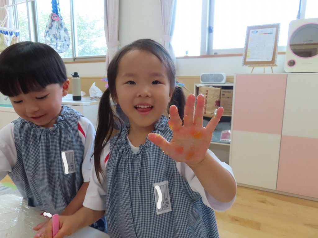 手に付いた絵の具を見せてくれたり、紙にペタペタと付けたりして真っ白だった画用紙もカラフルになりました!