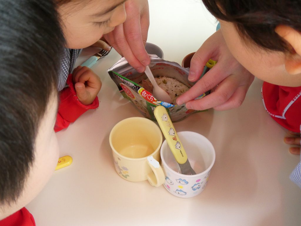 いつも食べている給食とは違い味も食器も違いましたが、子どもたちはあまり抵抗もなくよく食べていました。お水やお湯を注いでできる防災食。簡単ではありますがいざ園児分を作るとなると私たち職員もてこずってしまい、問題点がいくつかでてきました。災害は起きないことが一番ではありますが、起きたときに慌てず安全に行動できるように、これからも訓練を積み重ねて防災食についても子どもたちと一緒に学んでいきたいと思います(*^^*) ❝もしも❞の備え、ご家庭でも会話の中で話題にしてみたりまた見直しなどされてみてください。