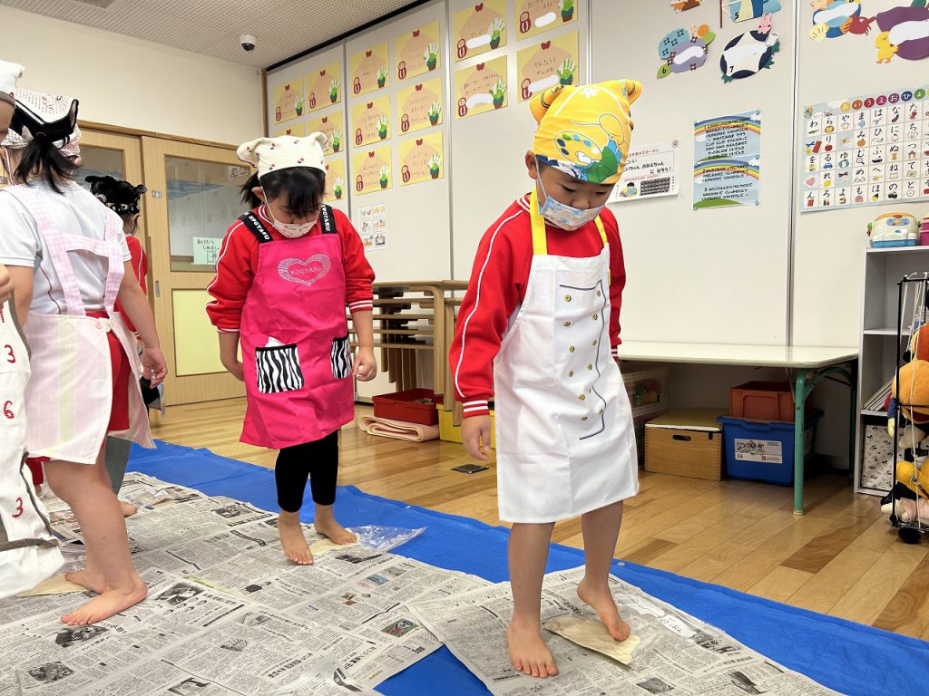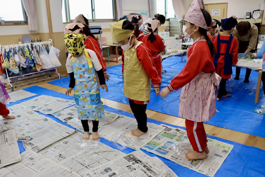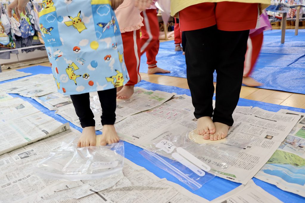 一人ずつ足で踏む体験もしました👣「おいしくなーれ♪おいしくなーれ♪」