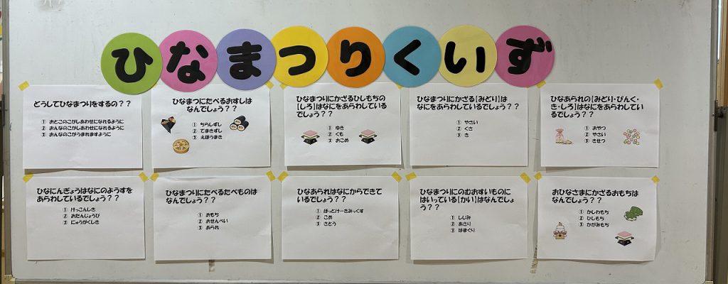2階の掲示板前にはいくつかクイズを出して掲示してみましたよ(*^^*)いくつ解けたかな?今日はご家庭でもひな祭りについて子どもたちと一緒に話題にしてみてください☆彡